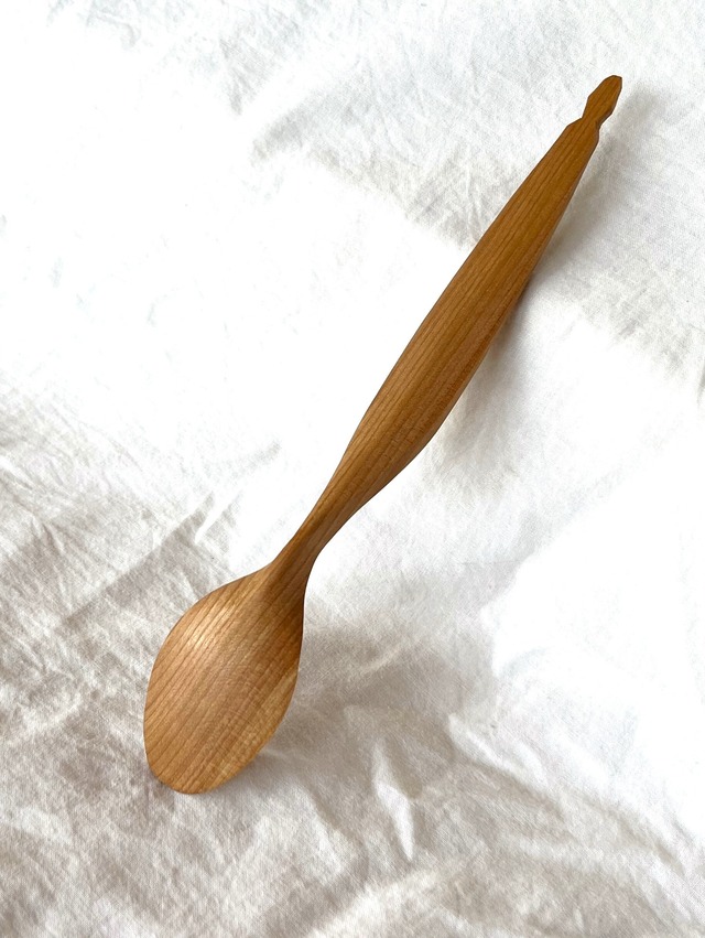 生木をチェーンソーで玉切りし、斧で割りざっくり削った後にナイフで削る「グリーンウッドワーク」の手法で作った一点もののスプーンです。 材種:マカバ(北海道中川町近郊産) サイズ:長さ21cm、さじ面の長さ55mm、さじ面の幅38mm 仕上げ:蜜蝋ワックス(原材料:中川町産蜜蝋とクルミオイル) マカバは落ち着いた赤みのある色合いと緻密な木目を持つ木です。 普段のお手入れは、使用後にぬるめのお湯か水で柔らかいスポンジで洗う程度で大丈夫です。強い油汚れには中性洗剤を薄めてご使用ください。洗った後はすぐに拭き、風通しの良いところに置くと長持ちします(水切りかごに入れっぱなしにすると下の方がカビやすくなります)。 さじ面がかさついてきたら、240番程度の紙やすりをかけ、柔らかい布かキッチンペーパーなどで亜麻仁油やクルミ油などの乾性油を塗って余分な油をふき取り、1週間程度おいておいてから使ってください。乾性油を塗ったりふき取る際に使用した布やペーパーは放置すると発火の恐れがありますので、大量の水で濡らして乾かないようにして捨ててください。 口当たりを良くするためさじ面の縁を薄く作ってあります。落としたりぶつけたりお子様がかじるなどすると縁が欠けることがあります。 蜜蝋(ミツバチがはちみつを貯める巣)を含むワックスで仕上げてあり、はちみつを含む可能性があります。一歳未満のお子様が使用することのないようご注意ください。