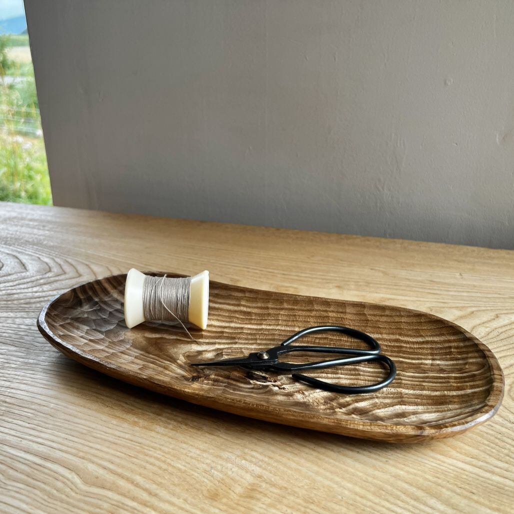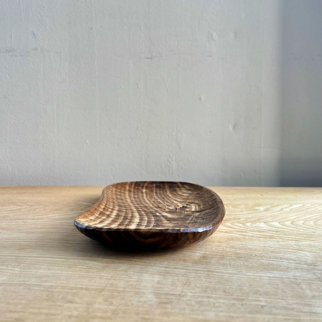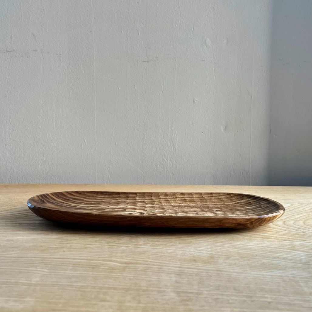 鑿あとを残して仕上げたごく浅いトレイです。通常木工品に使われることのない木の芯や股付近はむしろ魅力的な木目を持っており、そういった複雑な模様や細かな割れもお楽しみいただきたいと思い作りました。個性的な木の器です。