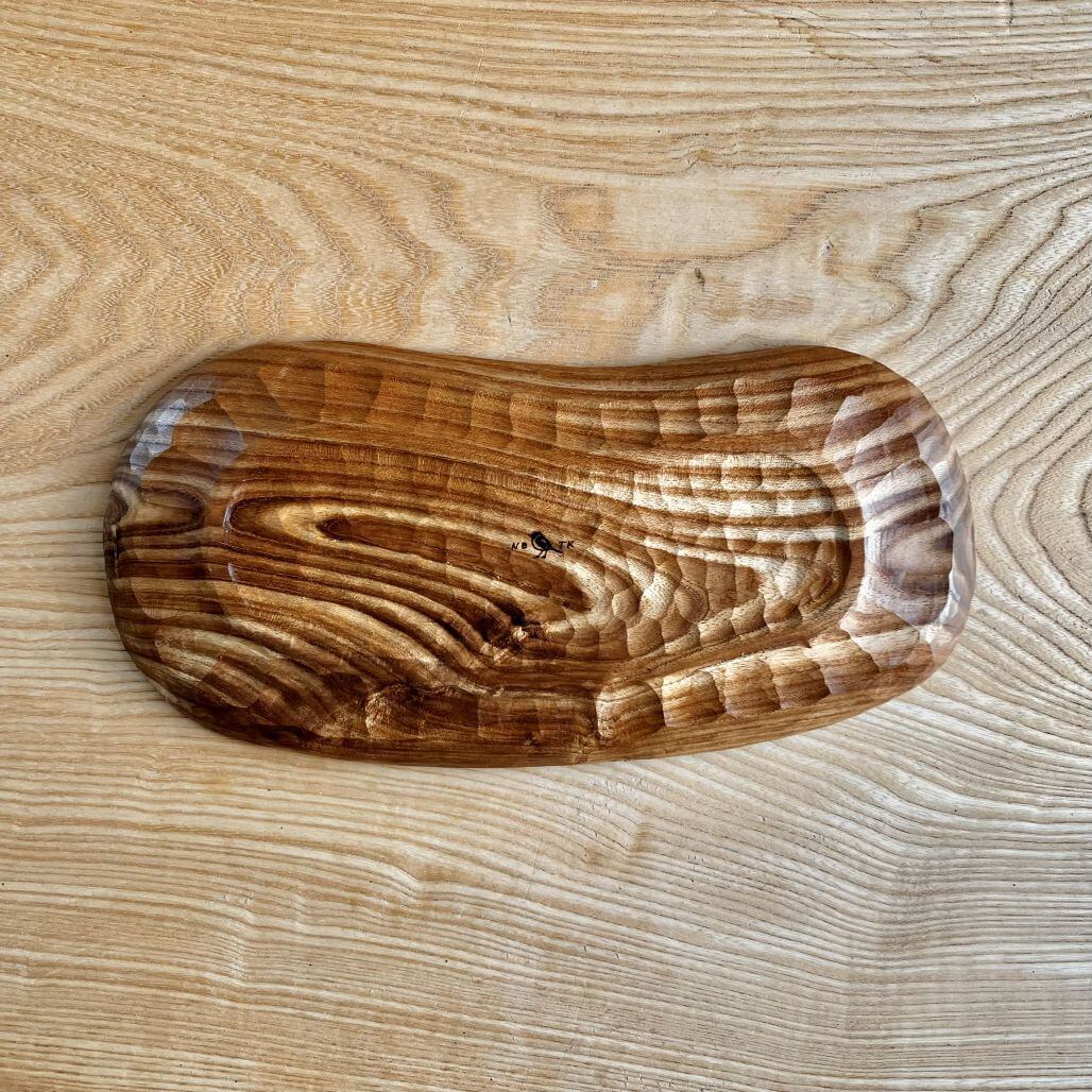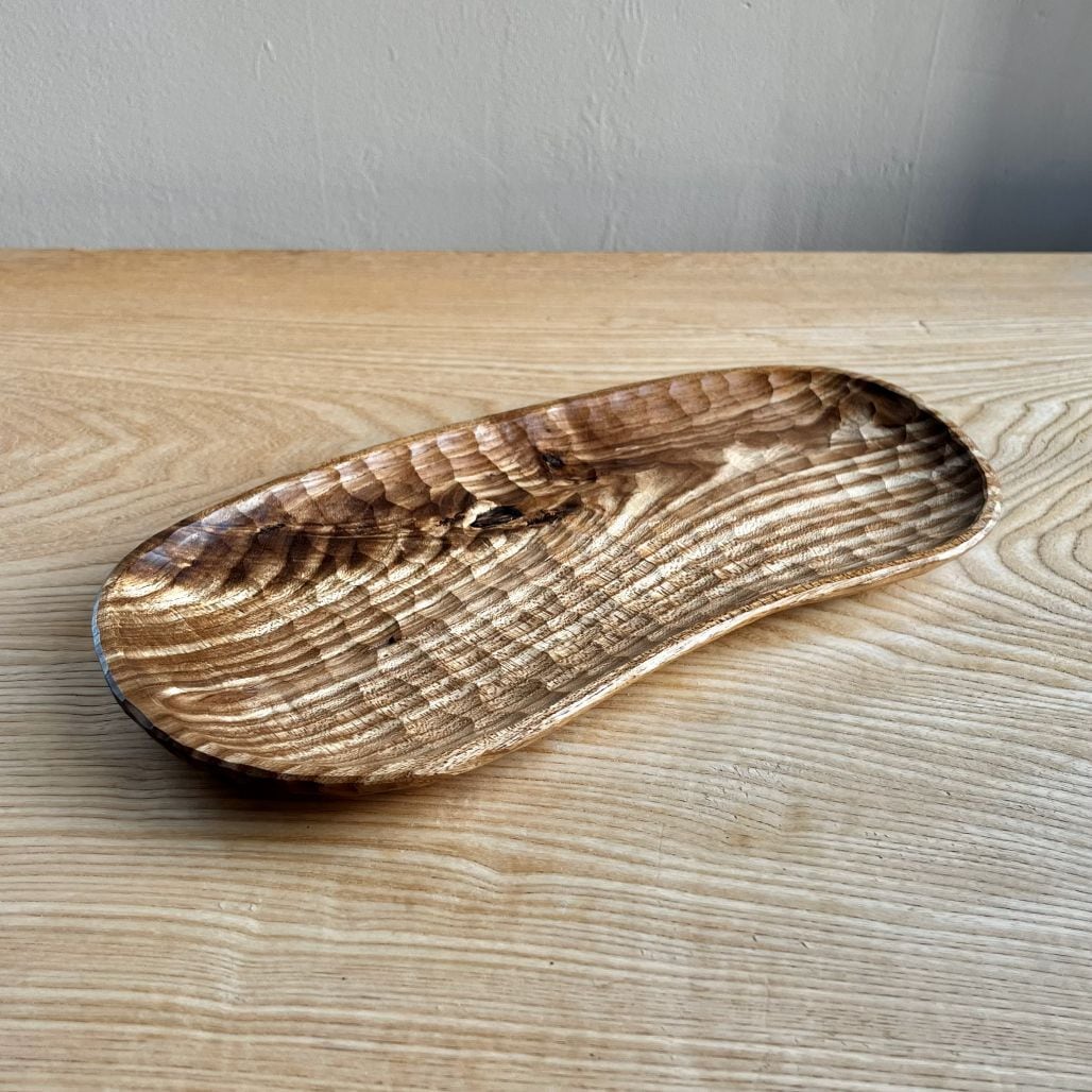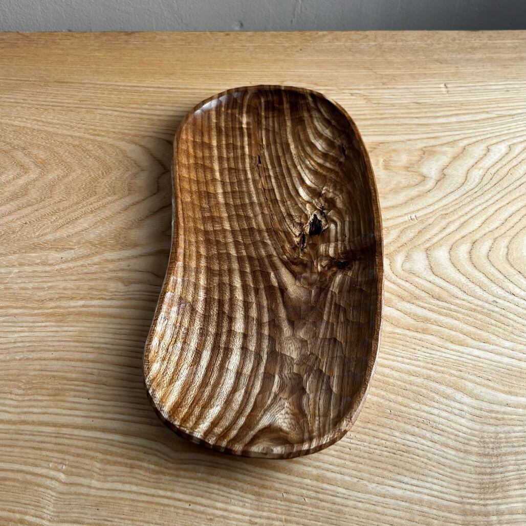 鑿あとを残して仕上げたごく浅いトレイです。通常木工品に使われることのない木の芯や股付近はむしろ魅力的な木目を持っており、そういった複雑な模様や細かな割れもお楽しみいただきたいと思い作りました。個性的な木の器です。