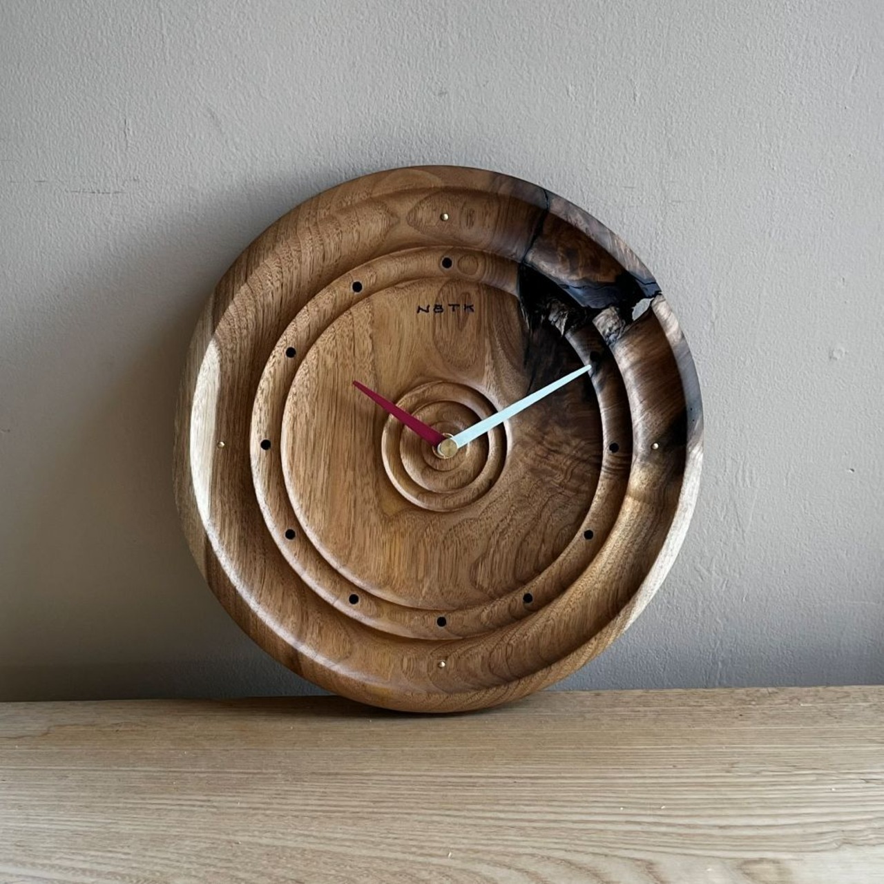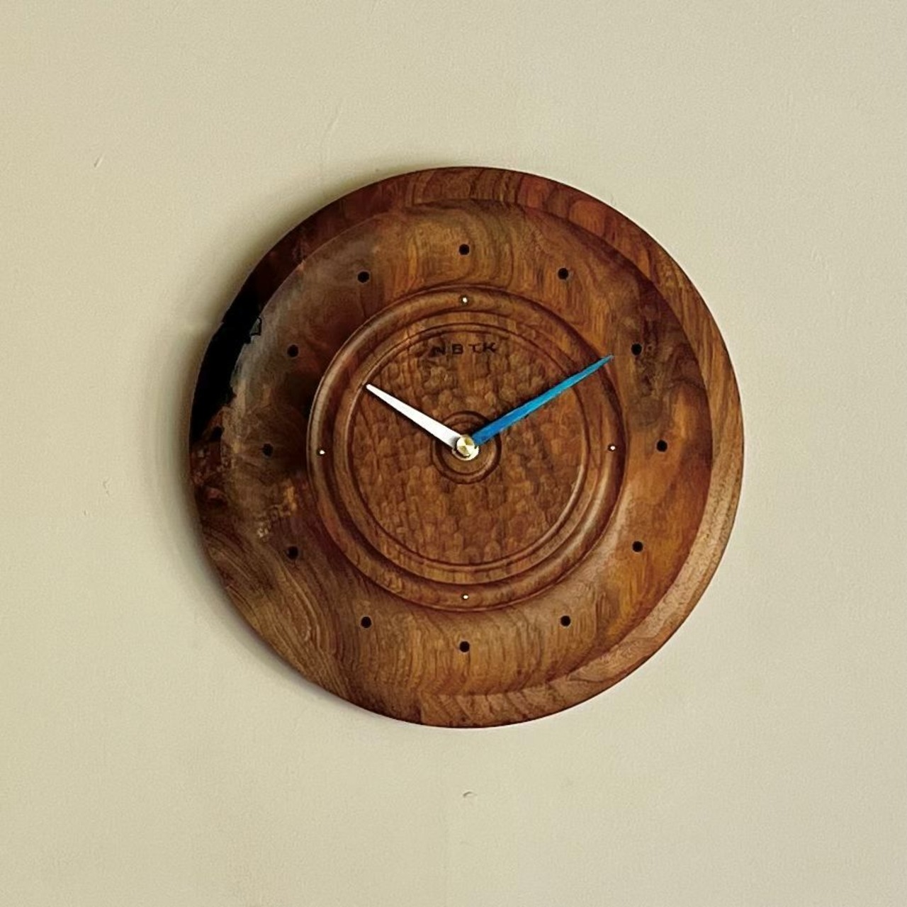 それぞれに独特な木目のオニグルミの掛け時計です。表面に凹凸があるため光の当たり具合で表情が変わります。欠けや割れ、色の変わった部分も木の一部としてお楽しみください。