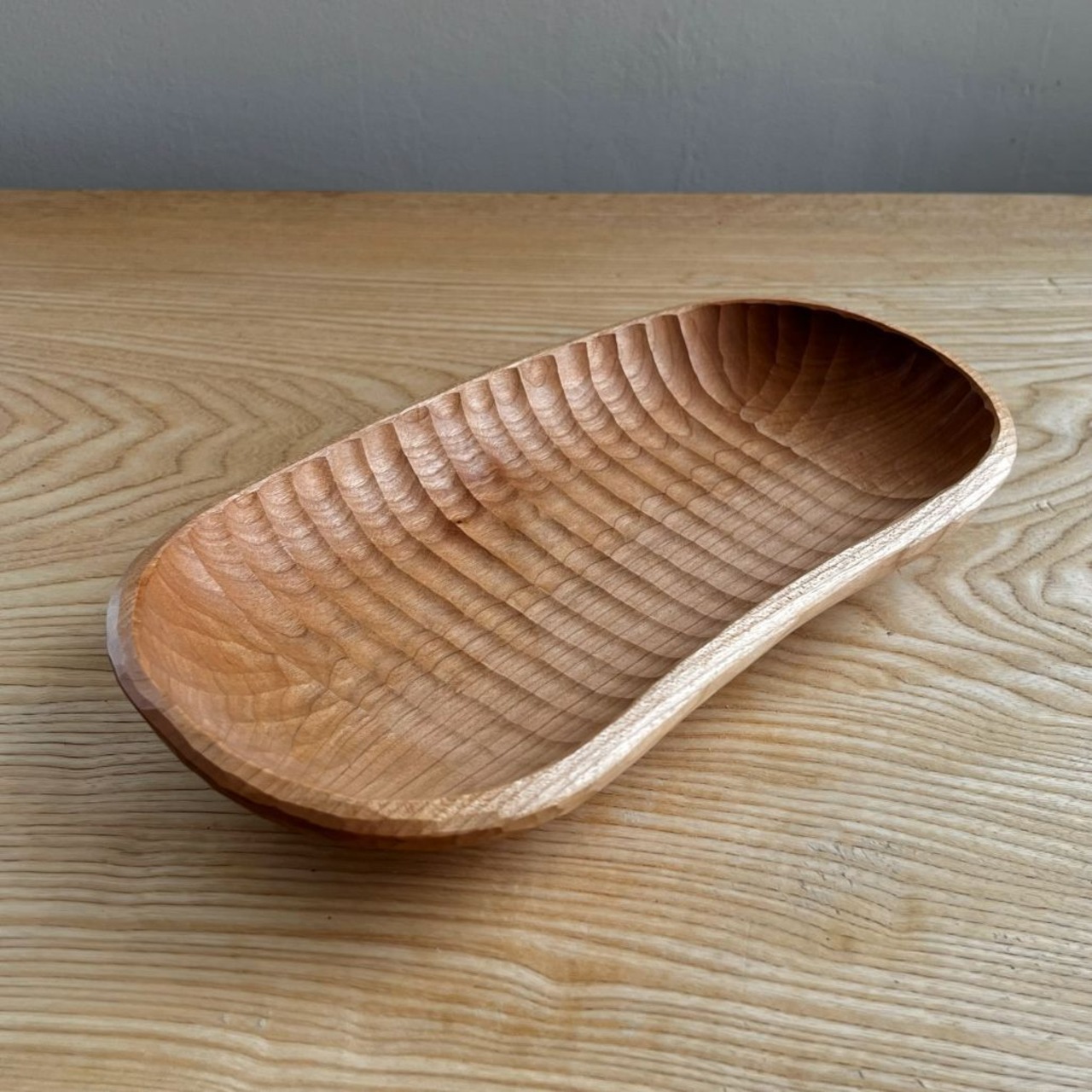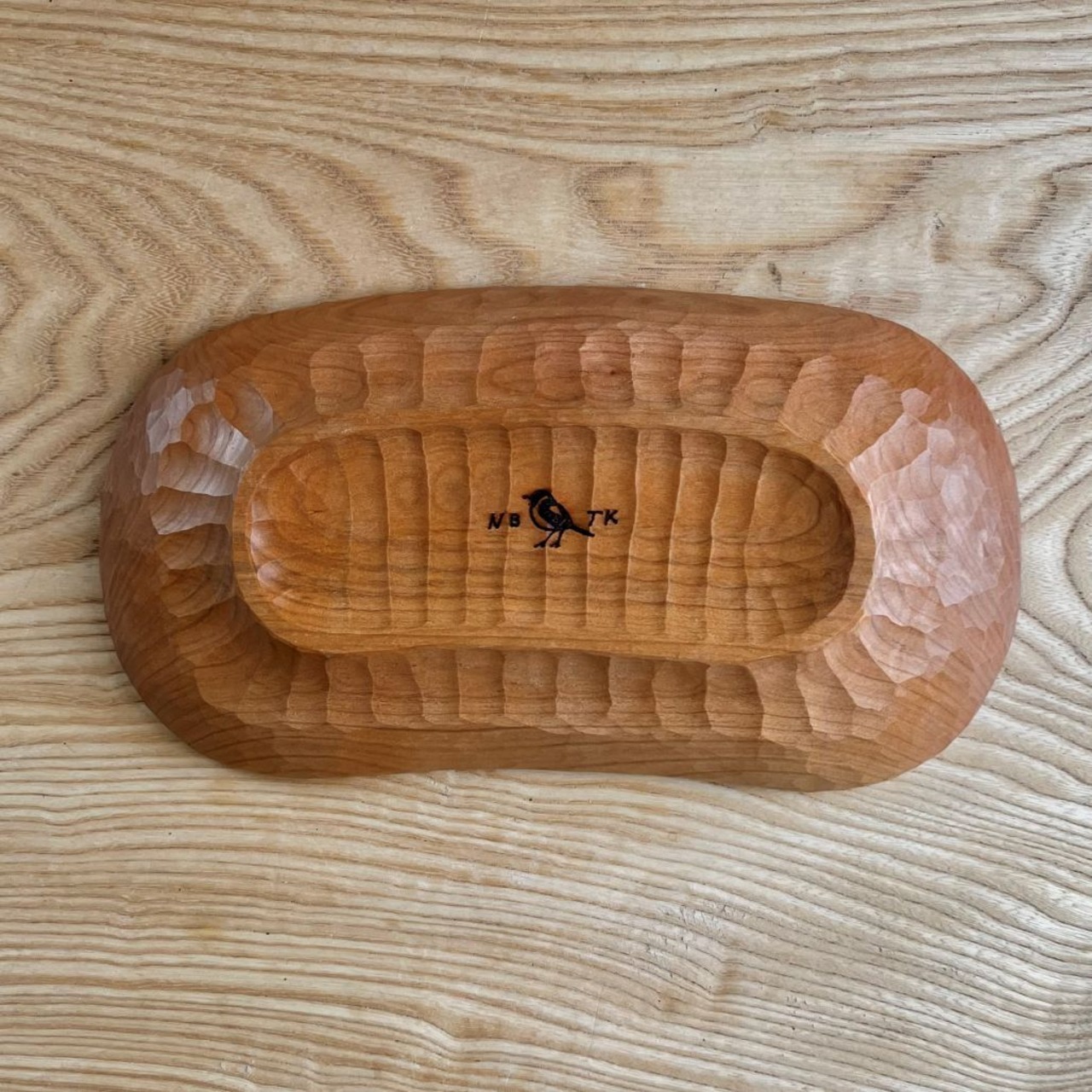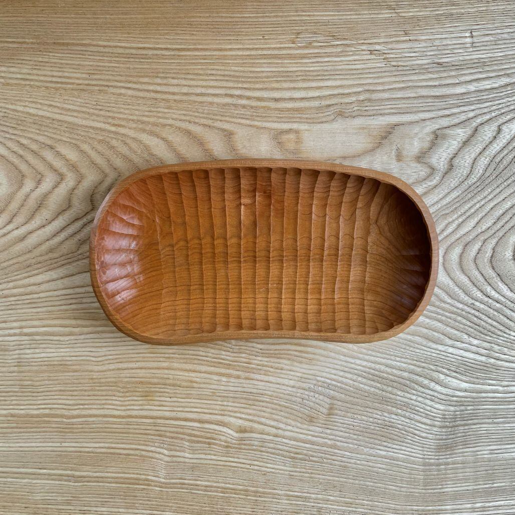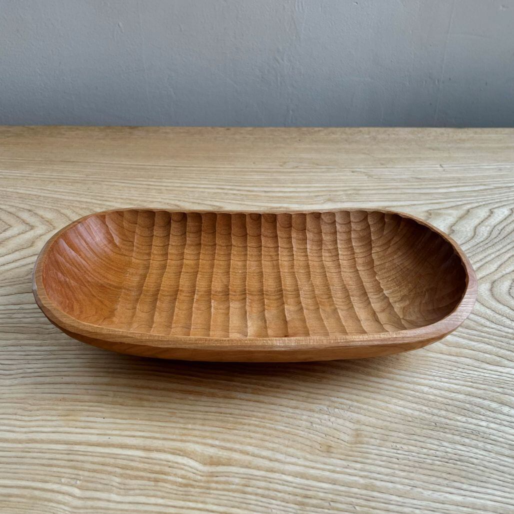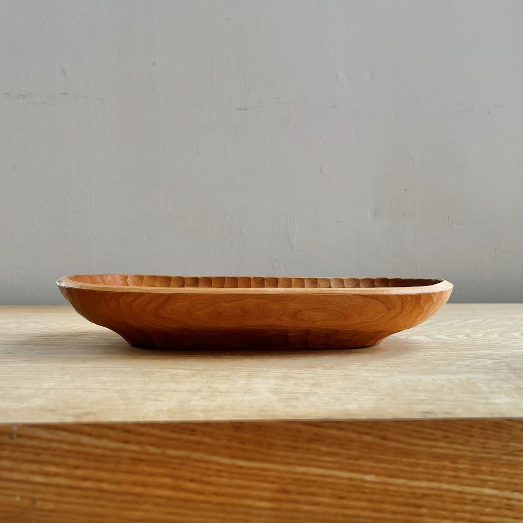 程よい深さ、程よい大きさの包容力のある形の、食器としても雑貨をのせても使えるトレイです。表裏に鑿あとを残しました。赤みのあるサクラらしい色が出た材で作りました。