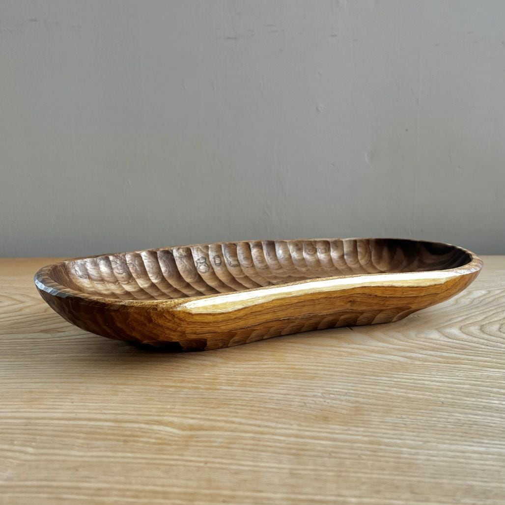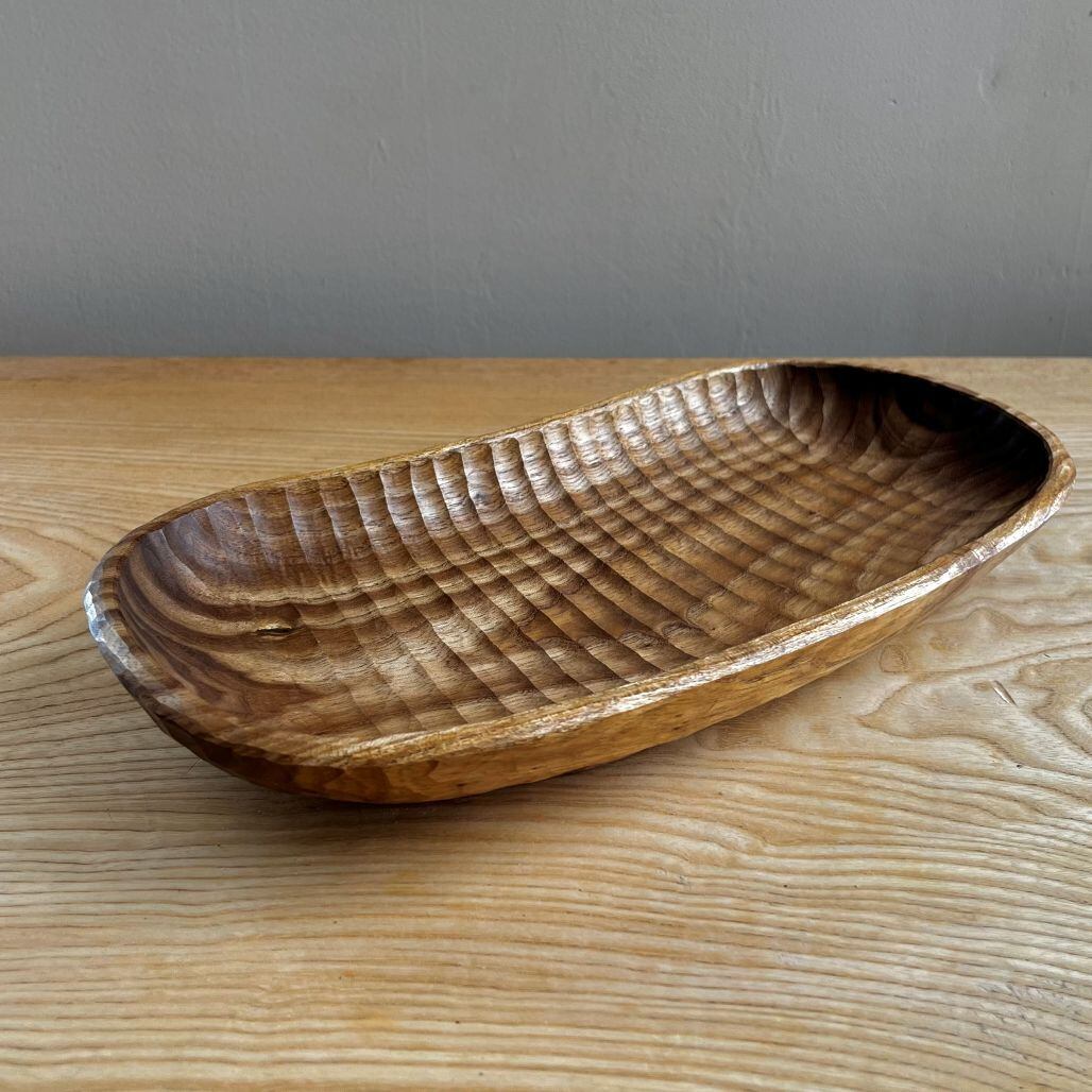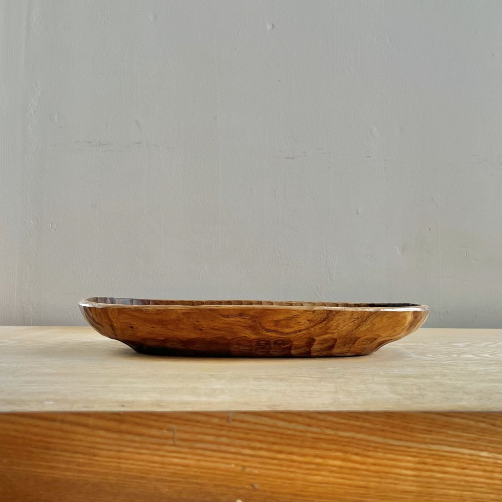 曲がった木を曲がったまま鑿あとを残した器にしました。光の当たると表面のデコボコが表情を変え、テーブルの上に置くと存在感が出ます。