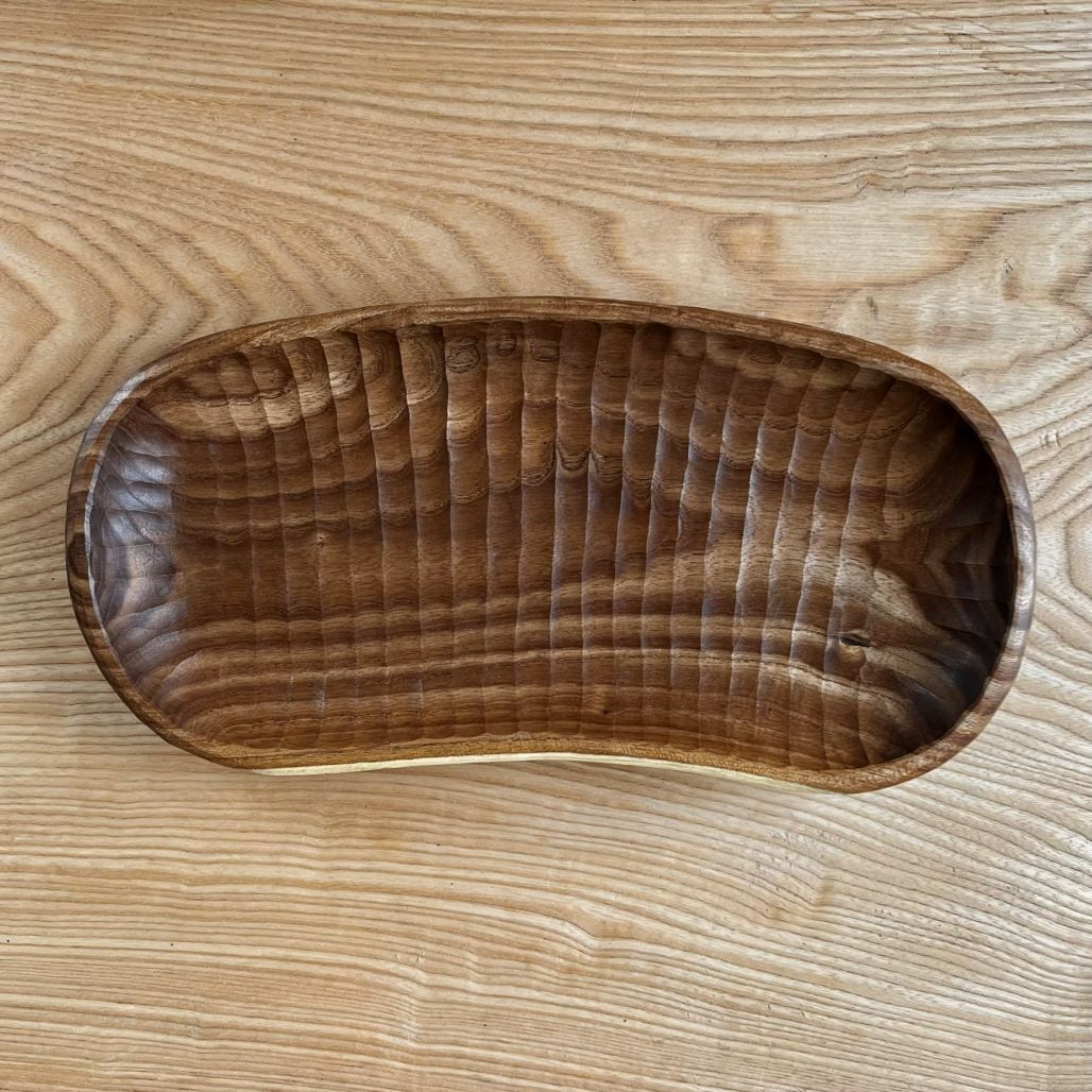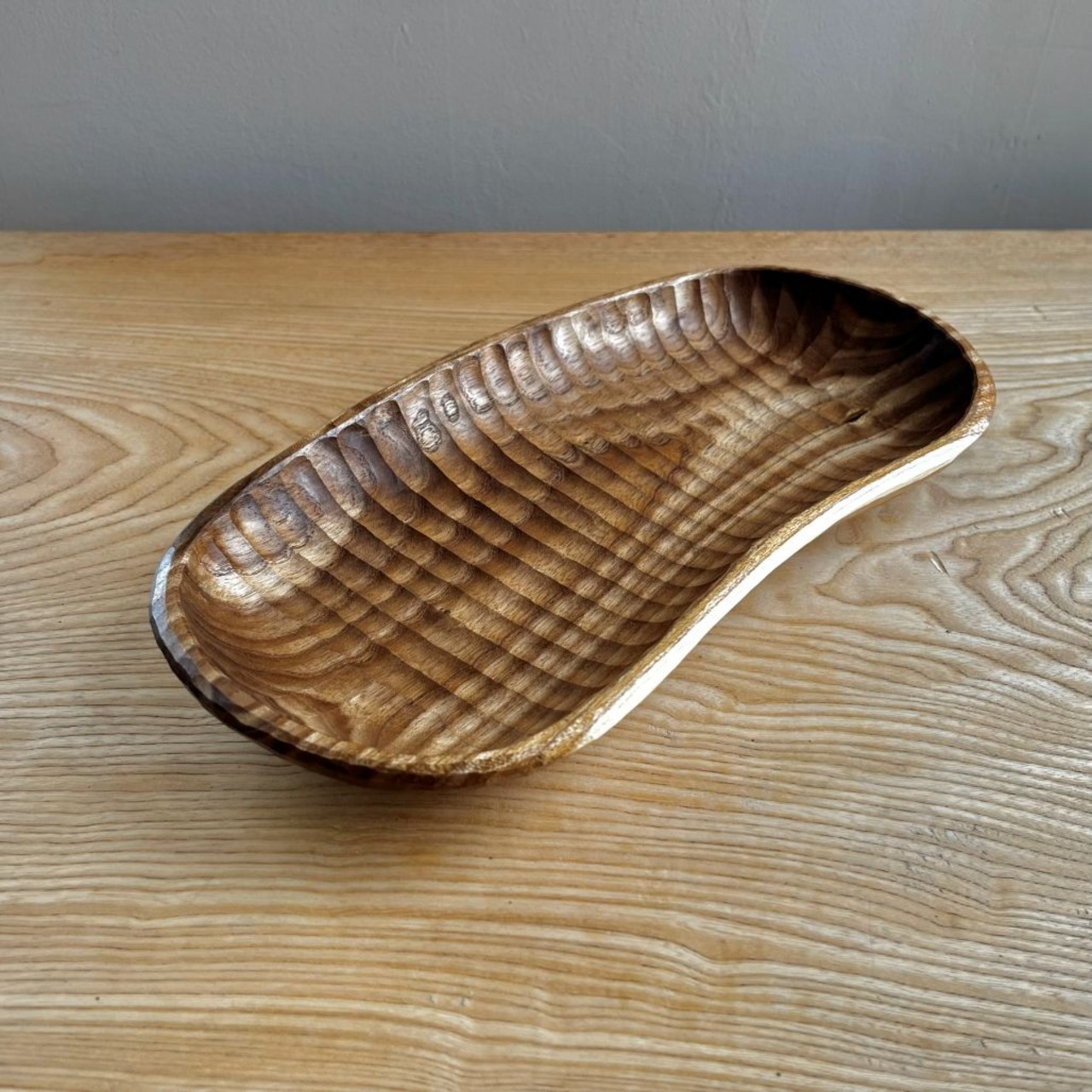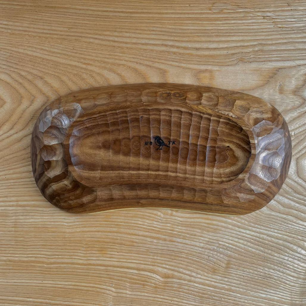 曲がった木を曲がったまま鑿あとを残した器にしました。光の当たると表面のデコボコが表情を変え、テーブルの上に置くと存在感が出ます。