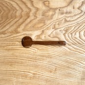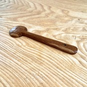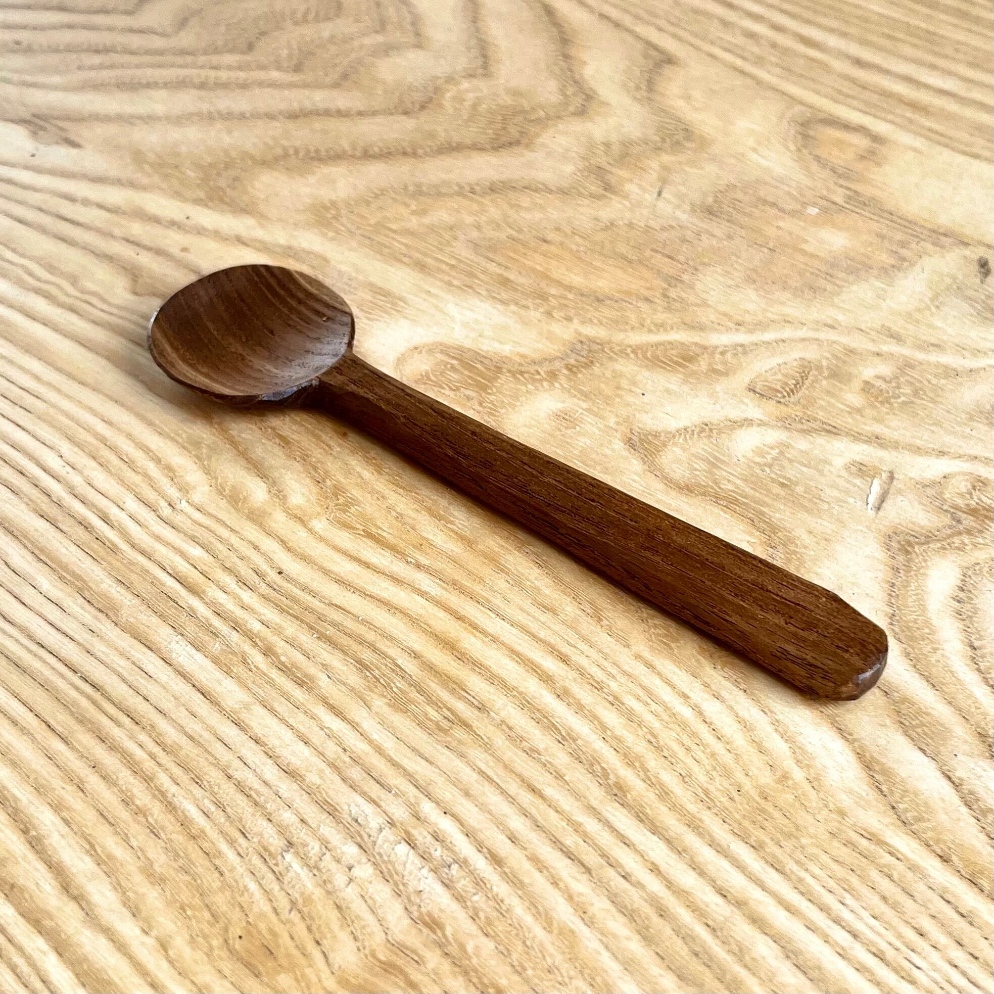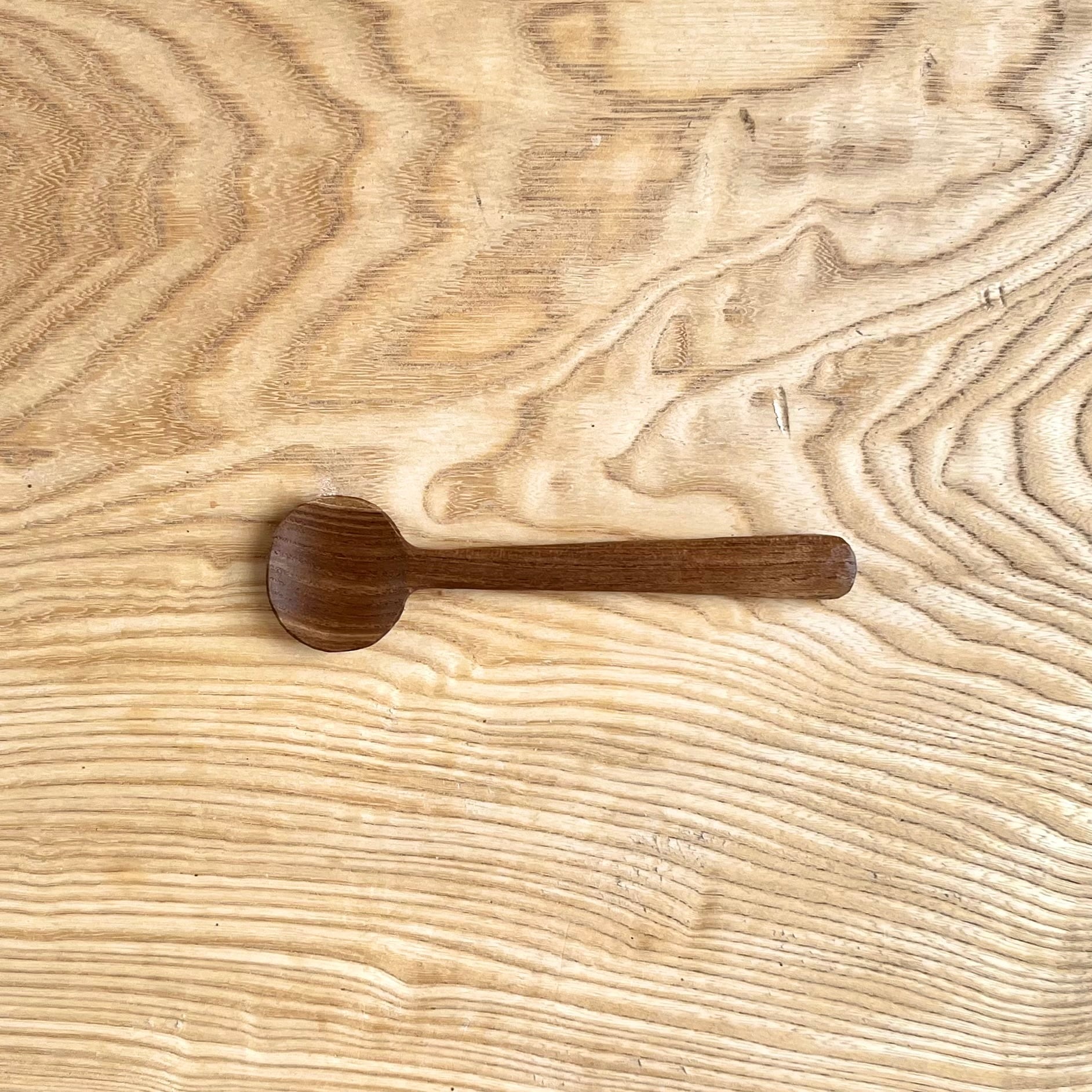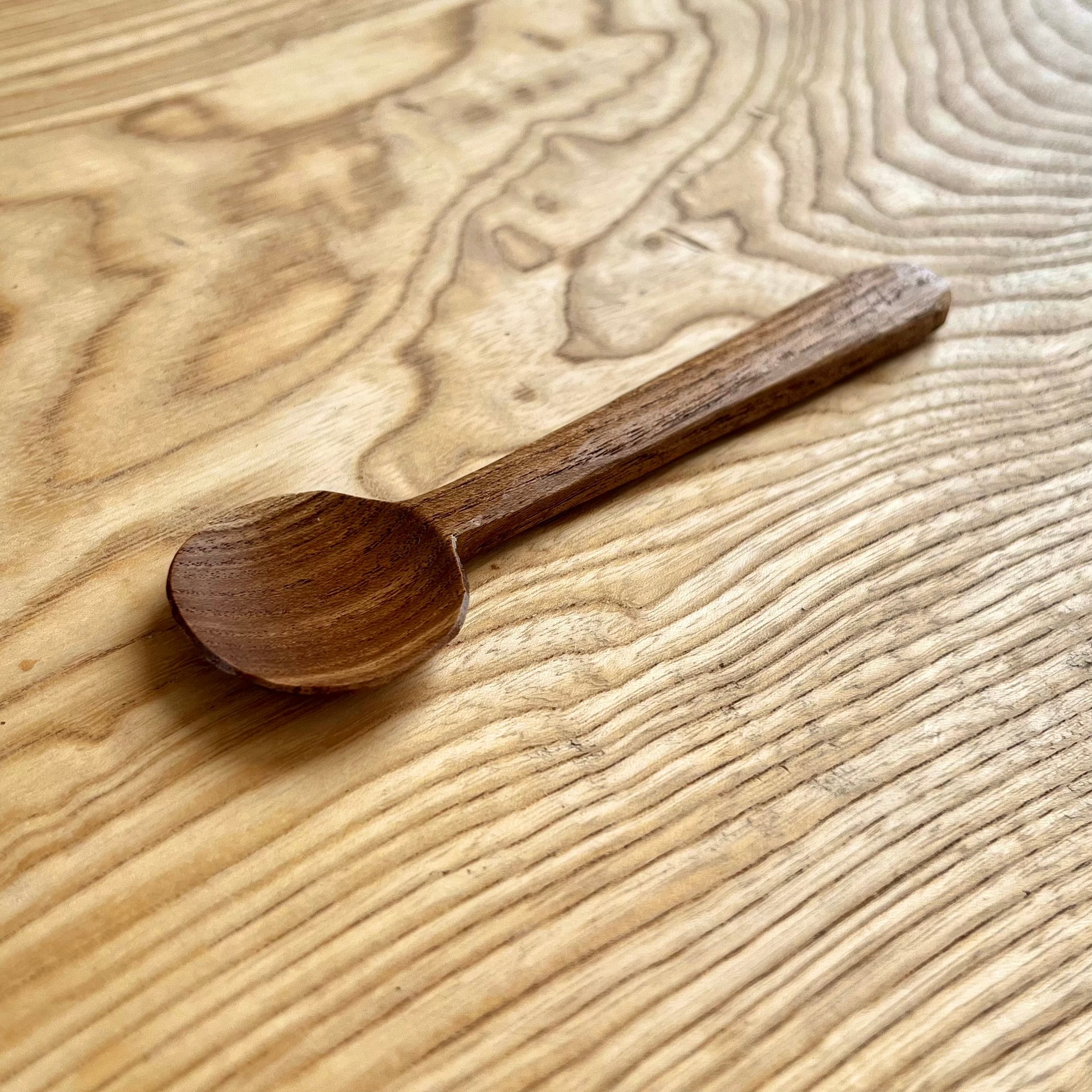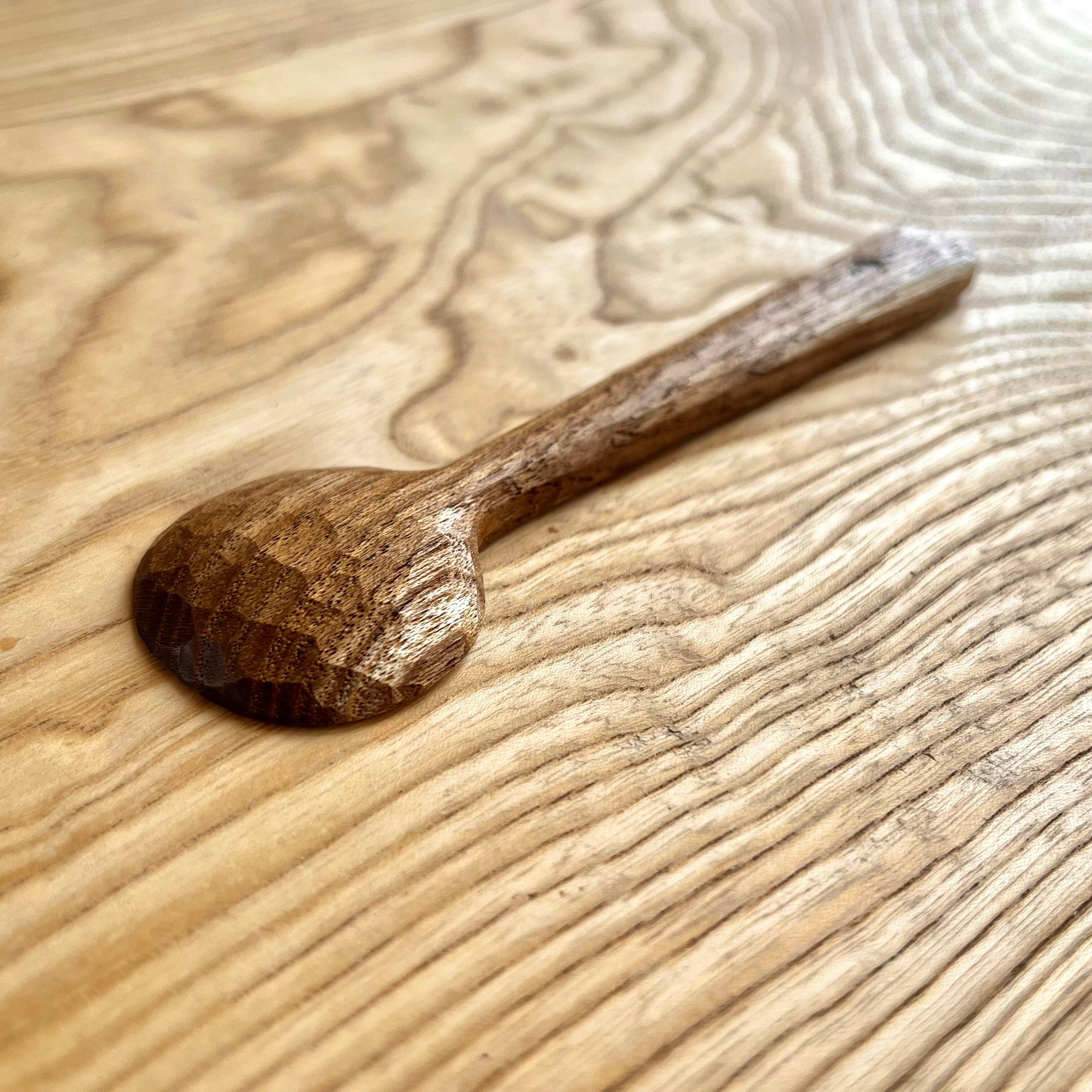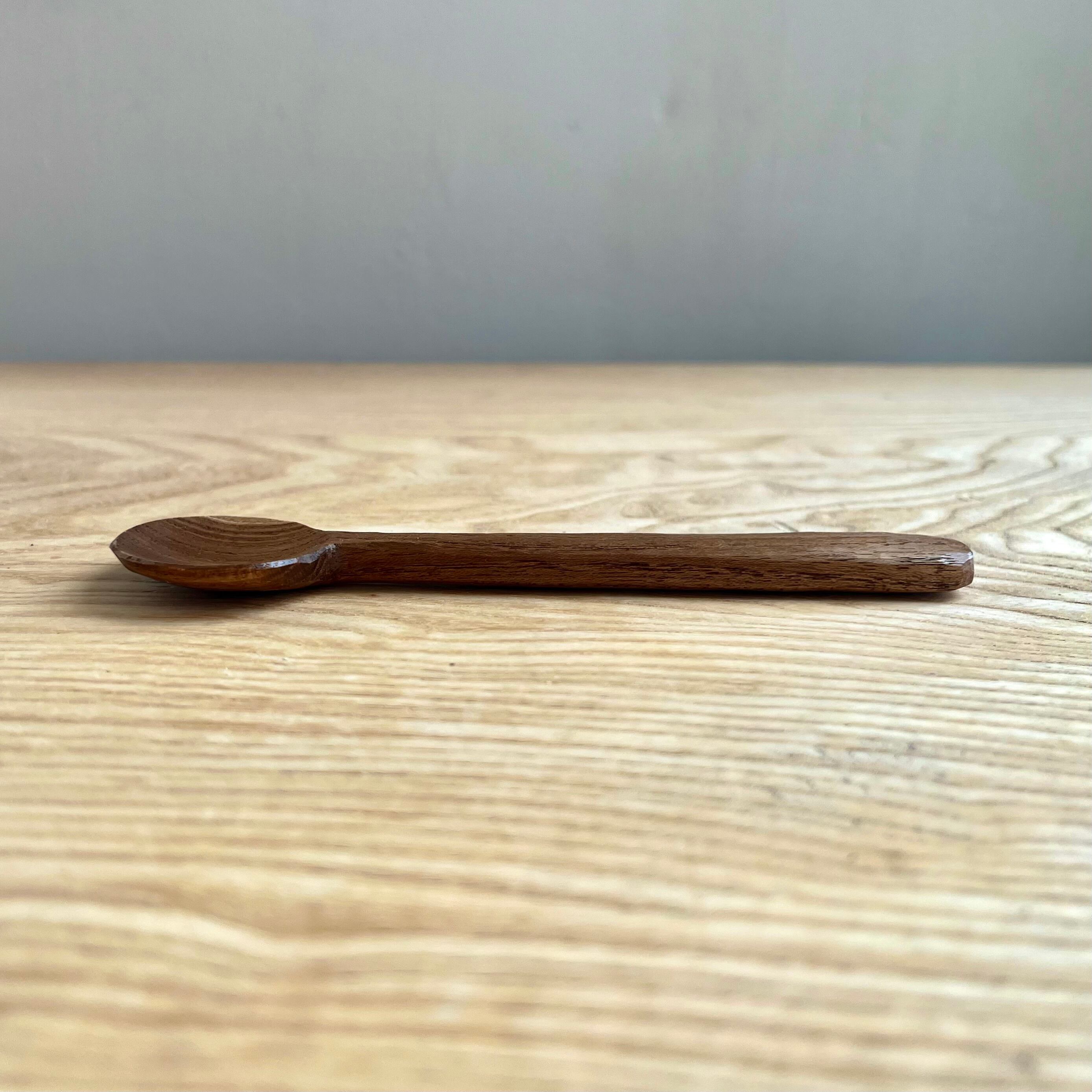 視力を測るとき時に目に当てる遮眼子のようなかたちのスプーンです。首のところが曲がっておらずまっすぐで、さじ面(食べ物を乗せるところ)は浅くすっと口から引き出せるように作ってあり、ヨーグルトやプリンなどのデザートを食べるのにちょうど良い大きさです。さじ面のみ磨いてありますが、その他はナイフで仕上げ、裏側は手彫りの跡を残してあります。
